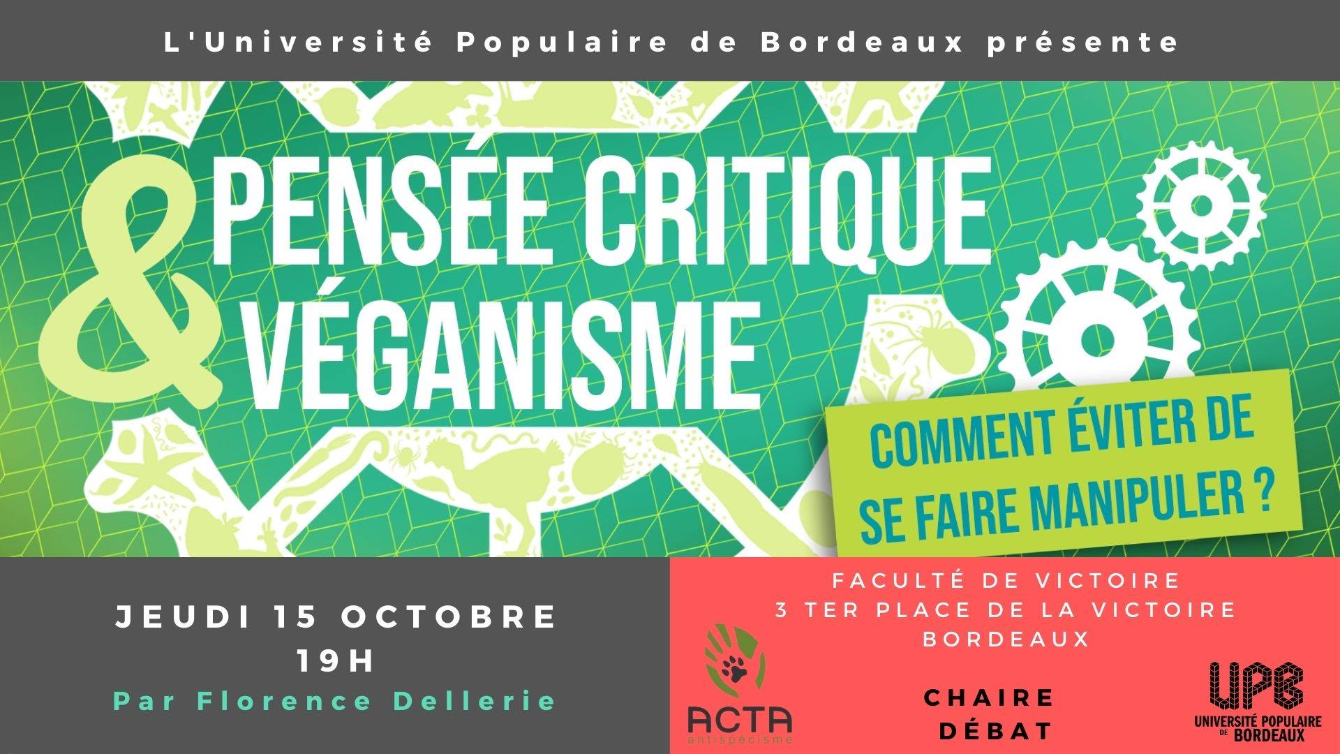 Et puis, alors que nous préparions la venue de Florence Dellerie pour deux conférences les 15 et 17 octobre (dont une conférence publique organisée par l’Université Populaire de Bordeaux directement sur le campus de la Victoire et une conférence spéciale pour aider les militant·es à développer leur esprit critique), il nous a fallu reporter, à nouveau à cause de la situation sanitaire, qui réduisait drastiquement la jauge de public envisageable et qui ne permettait donc pas d’avoir un impact aussi important que cet événement le méritait. Nous vous reparlerons de la date prévue en fonction de l’évolution de la situation. De même, la Journée Mondiale Végane, prévue et organisée pour le 1 novembre avec L214 et le Parti Animaliste, a dû être annulée.