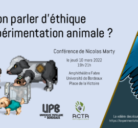 Le 10 mars, Nicolas Marty a donné une conférence à l’initiative d’ACTA et de l’Université Populaire de Bordeaux, sur la notion d’éthique en expérimentation animale. L’enregistrement de la conférence est maintenant disponible sur YouTube. https://www.youtube.com/watch?v=m1VFHQWNtpE&ab_channel=ActaGironde Résumé Vous avez probablement déjà entendu parler de vivisection, d’expérimentation animale ou d’utilisation des animaux à des fins scientifiques. Vous avez certainement vu passer quelques […]