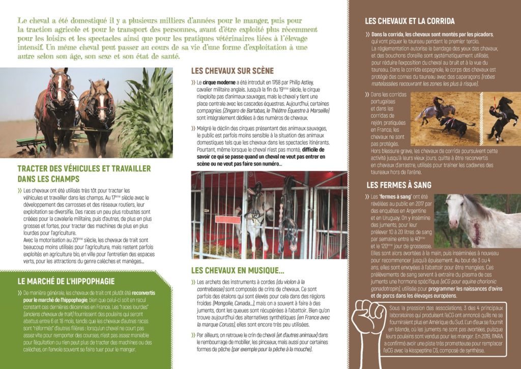 Le cheval a été domestiqué il y a plusieurs milliers d’années pour le manger, puis pour la traction agricole et pour le transport des personnes, avant d’être exploité plus récemment pour les loisirs et les spectacles ainsi que pour les pratiques vétérinaires liées à l’élevage intensif. Avec le lapin, c’est probablement l’animal exploité pour la plus grande variété d’usages. Mais contrairement à un lapin qui passera sa vie dans un seul cadre, un cheval a de grandes chances de passer au cours de sa vie d’une forme d’exploitation à une autre selon son âge, son sexe et son état de santé.