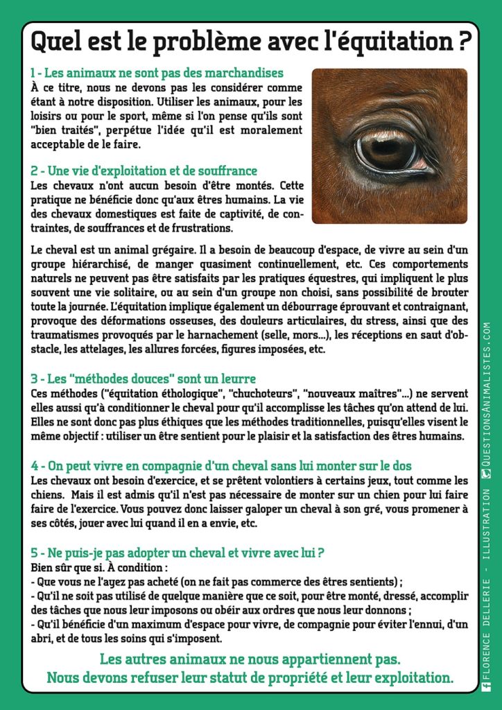 Le problème le plus évident avec l’équitation est que les chevaux dans les centres équestres sont fréquemment montés par des novices ne maîtrisant pas leur propre équilibre, serrant trop la selle, tenant les rênes trop haut, etc. Parmi 56 chevaux de races et d’âges variables dans 3 centres équestres, Pawluski et al. (2018) ont observé, en accord avec la seule autre étude existant sur le sujet (e.g. Lesimple et al. 2011), que 73% de ces chevaux étaient “sérieusement atteints” par des problèmes de dos. En plus du fait que les centres équestres sont souvent loin d’être optimaux en termes de modes de vie (box, nourriture, etc.), l’apprentissage de l’équitation serait donc la plupart du temps problématique pour la santé physique du cheval. Aujourd’hui, des pratiquant·es préfèrent donc passer du temps avec leur cheval en se promenant, sans le monter.