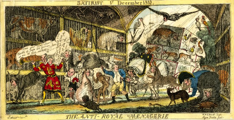Pendant la Révolution, des singes, cerfs et oiseaux, symboles de la tyrannie, sont livrés aux écorcheurs. Une partie de celleux qui restent formeront la base de la ménagerie du Jardin des Plantes à Paris (transformé en Muséum d’histoire naturelle en 1793). Il s’agira surtout des espèces herbivores, beaucoup moins attachées symboliquement à la royauté et à la violence. Alors que la critique de l’enfermement visible des animaux était quasiment absente jusqu’à la fin du 18e siècle, elle commence à s’y faire sentir, d’abord par cette association des ménageries avec la royauté, puis par comparaison avec les nouveaux aménagements. En effet, la combinaison des ménageries et des jardins botaniques donne lieu au 19e siècle à des arrangements nouveaux, dans lesquels les animaux se promènent en semi-liberté dans les jardins. C’est l’origine de l’expression « jardin zoologique », largement utilisée à partir du 20e siècle, en concurrence avec l’abréviation « zoo » en Angleterre. Les zoos se développent dès le 19e siècle dans tous les pays au même titre que les théâtres, musées et universités. (BHF1998)
