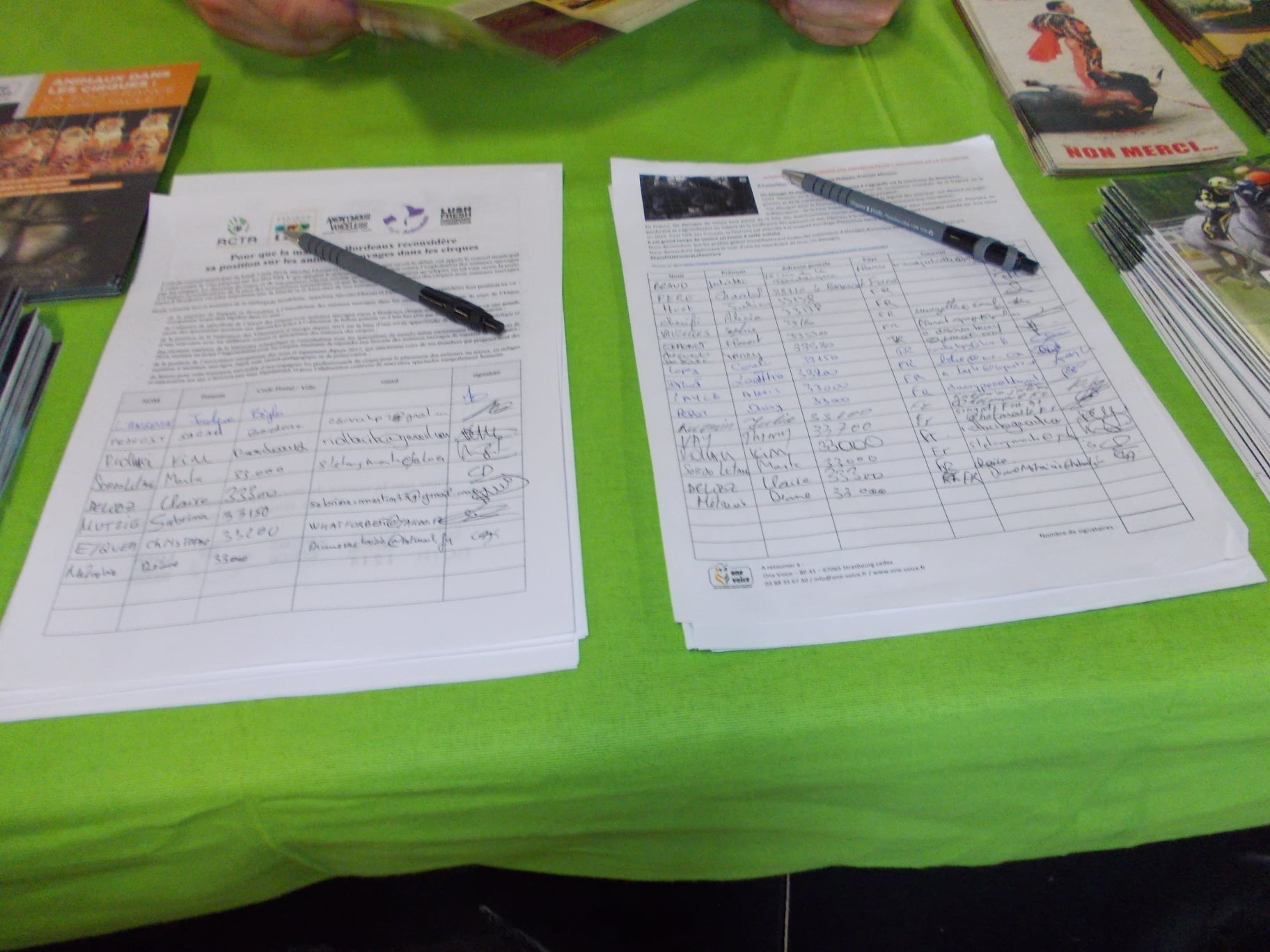 La journée est passée plutôt vite, puisque malgré assez peu de passage (ce qui semble typique de Cap Asso), nous avons pu discuter avec plusieurs personnes, fournir des informations et sensibiliser les gens, et faire signer des pétitions pour les droits des animaux.