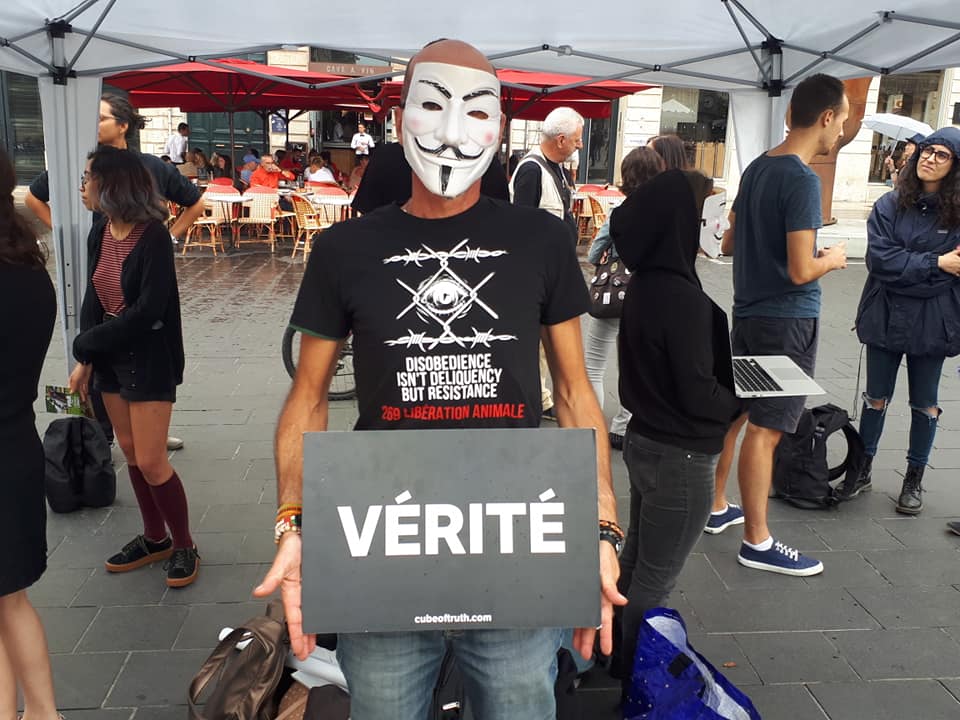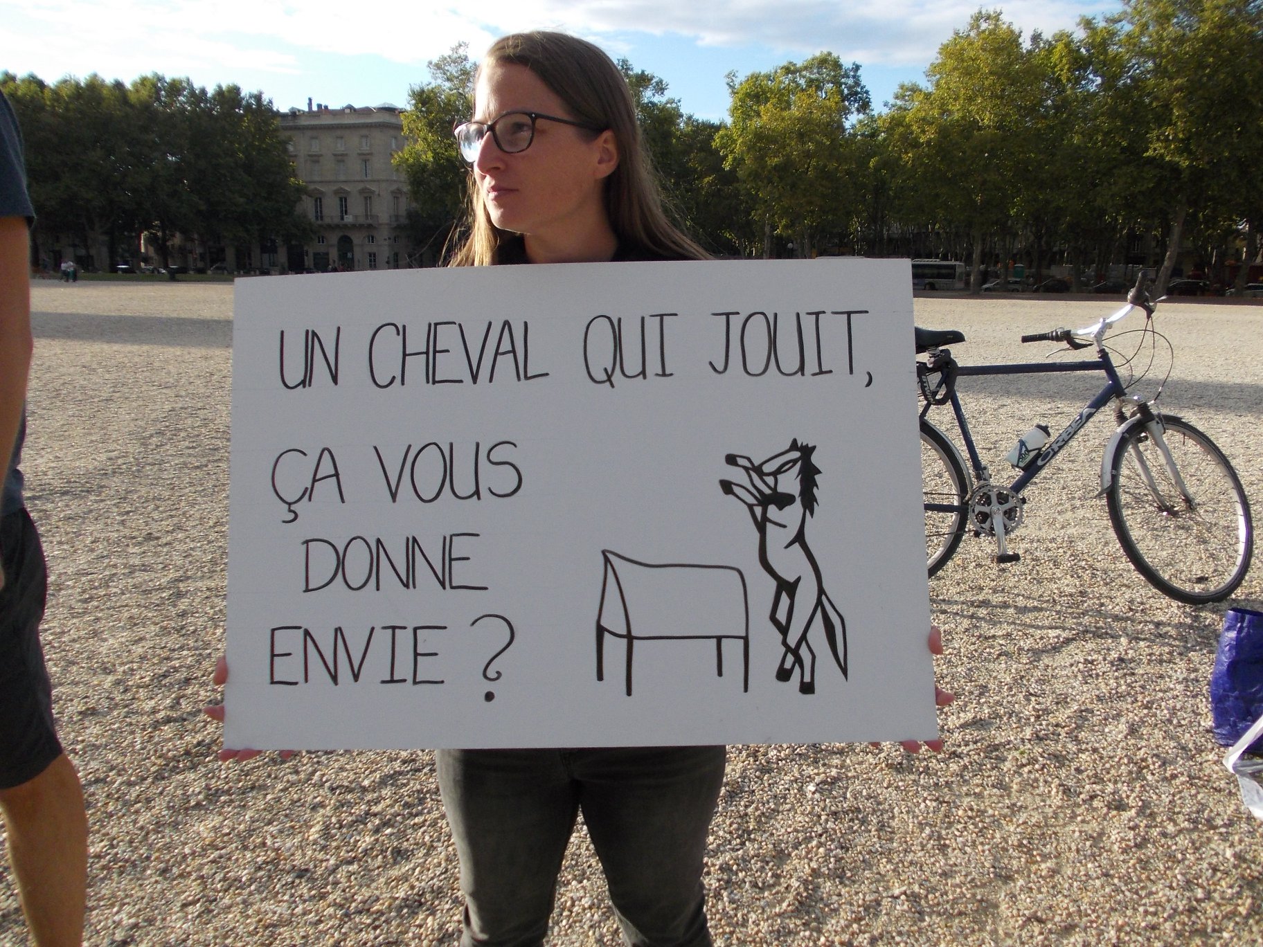 D’abord place de la Comédie pour un « Cube of Truth » avec Anonymous for the Voiceless, avec en plus des vidéos habituelles révélant les dessous de la production du lait de vache et des œufs de poule, des vidéos autour de l’exploitation des équidés, dans les milieux touristiques notamment, mais aussi dans le milieu des courses hippiques. Notre nouveau dépliant sur l’exploitation des chevaux a pu être donné aux personnes intéressées, ce qui permettra peut-être d’ouvrir une réflexion et une remise en cause de ces pratiques auprès du grand public.
