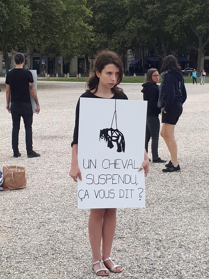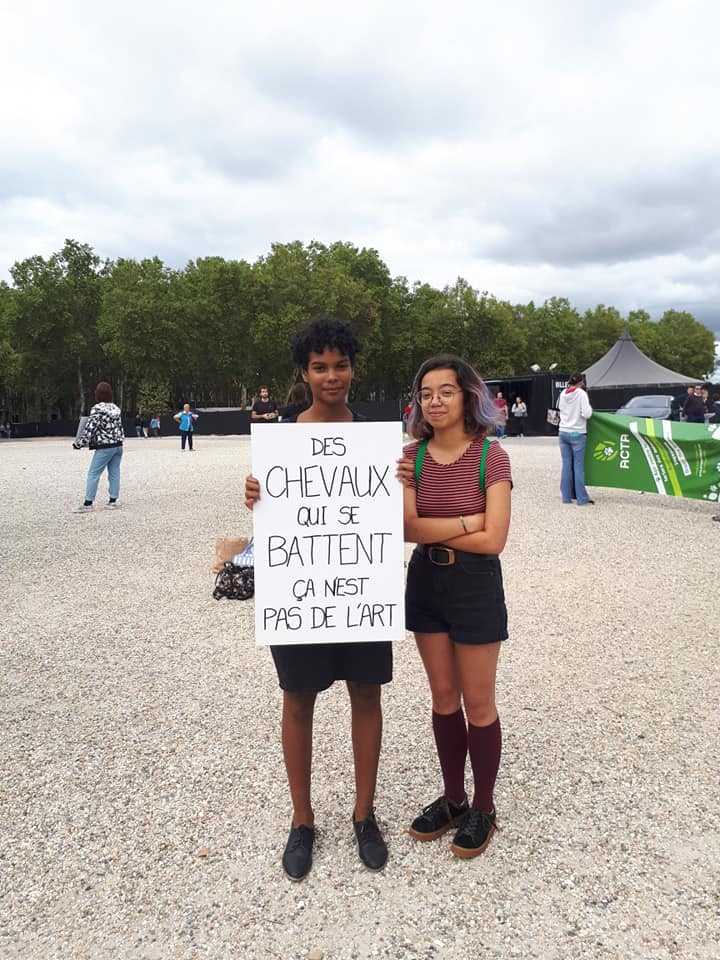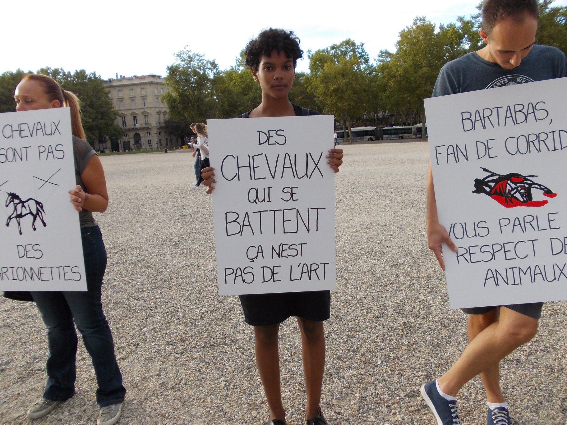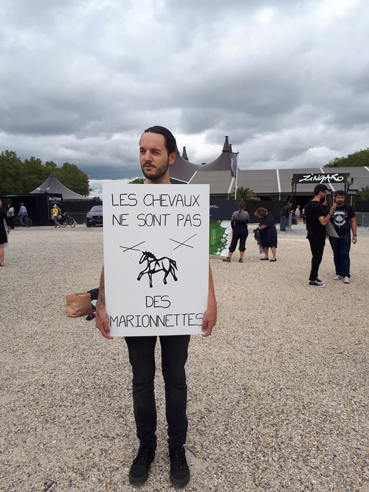 Sur la fin de la manifestation, un couple ayant assisté au spectacle la semaine dernière est venu nous voir pour nous remercier de manifester et nous donner leur témoignage, choqués par la scène de la saillie et la manière dont les chevaux étaient représentés en général. De plus, ces spectateurs ont remarqué tout le long du spectacle les mains des dresseurs qui donnaient des friandises aux chevaux dès qu’ils faisaient ce qu’ils devaient faire, mais qui jetaient aussi du sable vers eux quand les chevaux ne bougeaient pas assez et qui ont utilisé au moins une fois un petit fouet frotté au sol et claqué pour faire avancer un cheval. Alors que les dresseurs se veulent invisibles dans ce spectacle, ces spectateurs n’ont plus vu qu’eux après quelques minutes. L’image des chevaux libres, mise en avant par Bartabas pour ce spectacle, n’est bien que ça : une image.