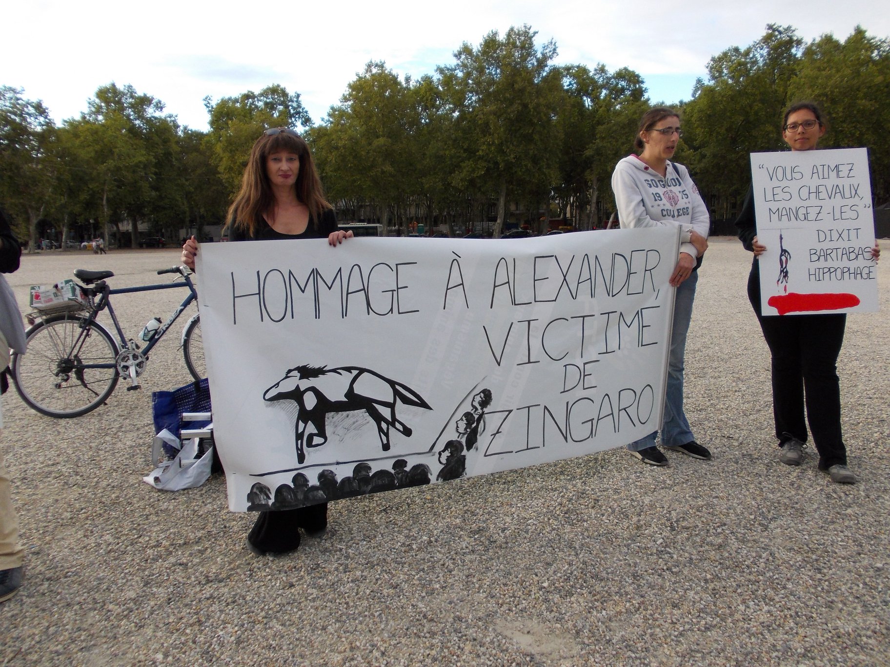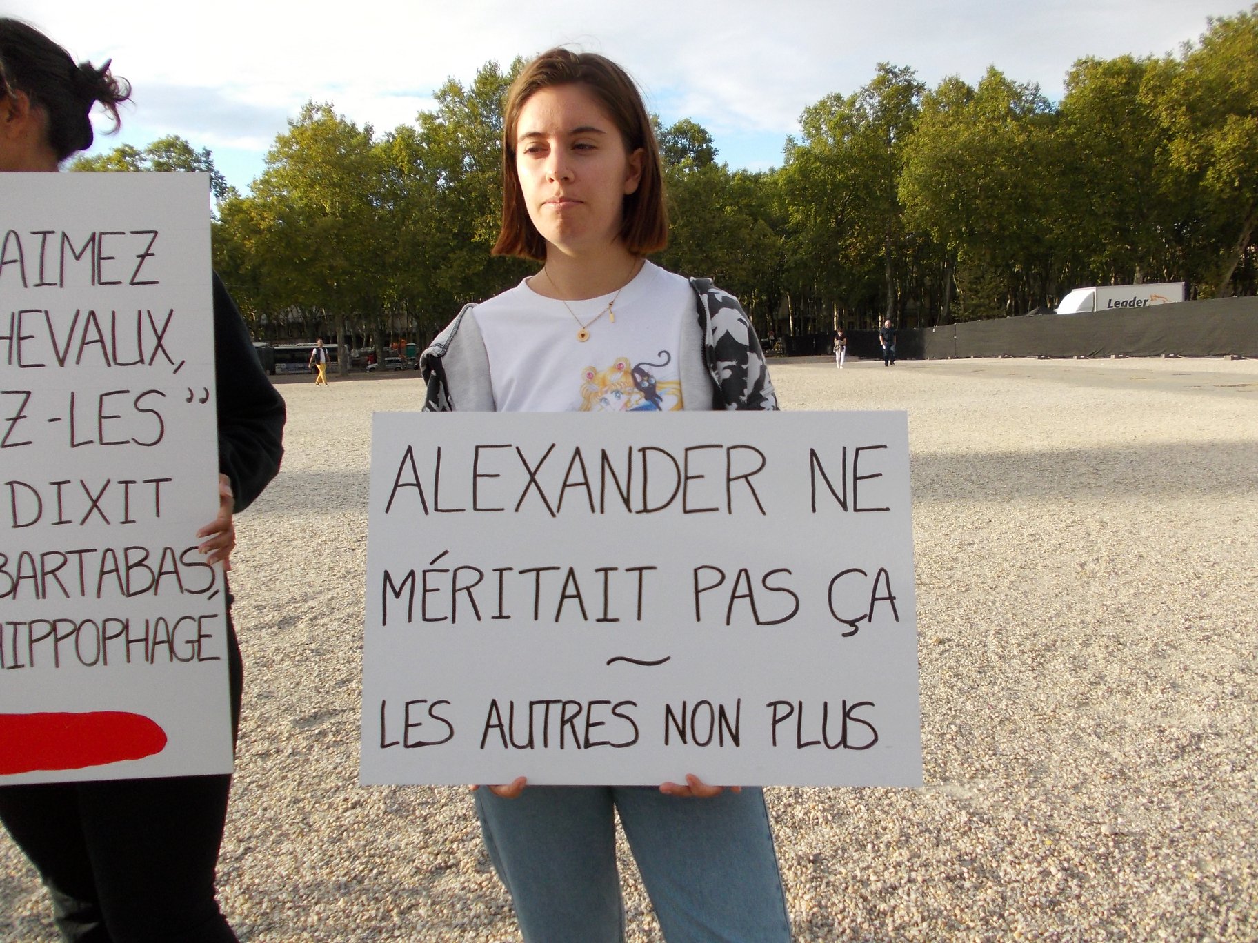 La banderole rendait également hommage à Alexander, poney euthanasié le mercredi 21 août, des suites d’une chute lors du spectacle de la veille. Là encore, nous pouvions rappeler aux spectateurs que, d’après les témoignages que nous avons reçu sur le spectacle dès le lendemain matin, Alexander avait été laissé à terre, convulsant, le temps de finir la scène – et que le spectacle avait repris comme si de rien n’était à la suite de l’accident.