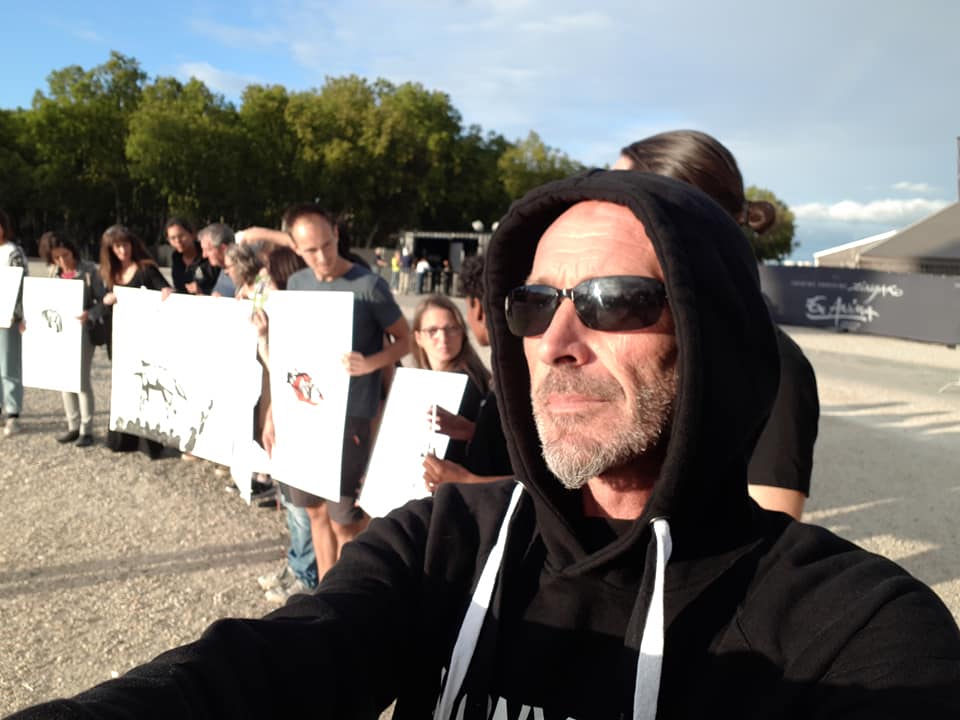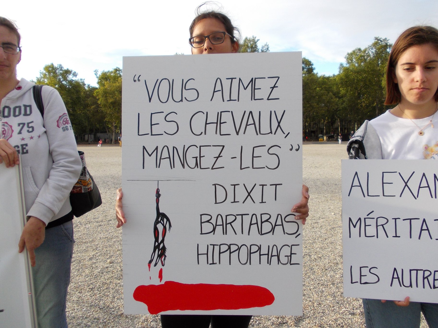 Nous avons ensuite déplacé le groupe, pour une manifestation avec panneaux et banderole, devant les chapiteaux de Zingaro, alors que les spectateurs et spectatrices arrivaient pour la représentation de 19h30. Le but : rappeler ou apprendre aux personnes qui venaient voir le spectacle que Clément Marty, alias Bartabas (responsable du théâtre Zingaro), est pro-corrida (les chevaux sont pourtant des victimes collatérales des corridas), pro-hippophagie, (on se souvient de sa célèbre phrase « Si vous aimez les chevaux, mangez-en », le seul argument trouvé étant pour sauver les 9 races de chevaux de trait amenées à disparaître). Comme un magicien avec ses tours de magie, Bartabas envoûte les amoureux des chevaux tout autant que les non-initiés, mais que se passe-t-il derrière la lumière, dans l’ombre et le quotidien ? Si Clément Marty a ses admirateurs, nombreux sont ceux qui ne cautionnent pas ses méthodes de dressage et ses entraînements – de nombreux témoignages allant du simple ressenti, malaise, mal-être pour certains, aux certitudes pour d’autres qui ont vu, connu et côtoyé celui qui a du mal à garder son sang-froid lorsqu’il est contredit et/ou contrarié. Comment peut-on imaginer que cette même personne soit en même temps dotée de patience et d’écoute pour obtenir de la part des chevaux ce qu’il appelle de la complicité ?