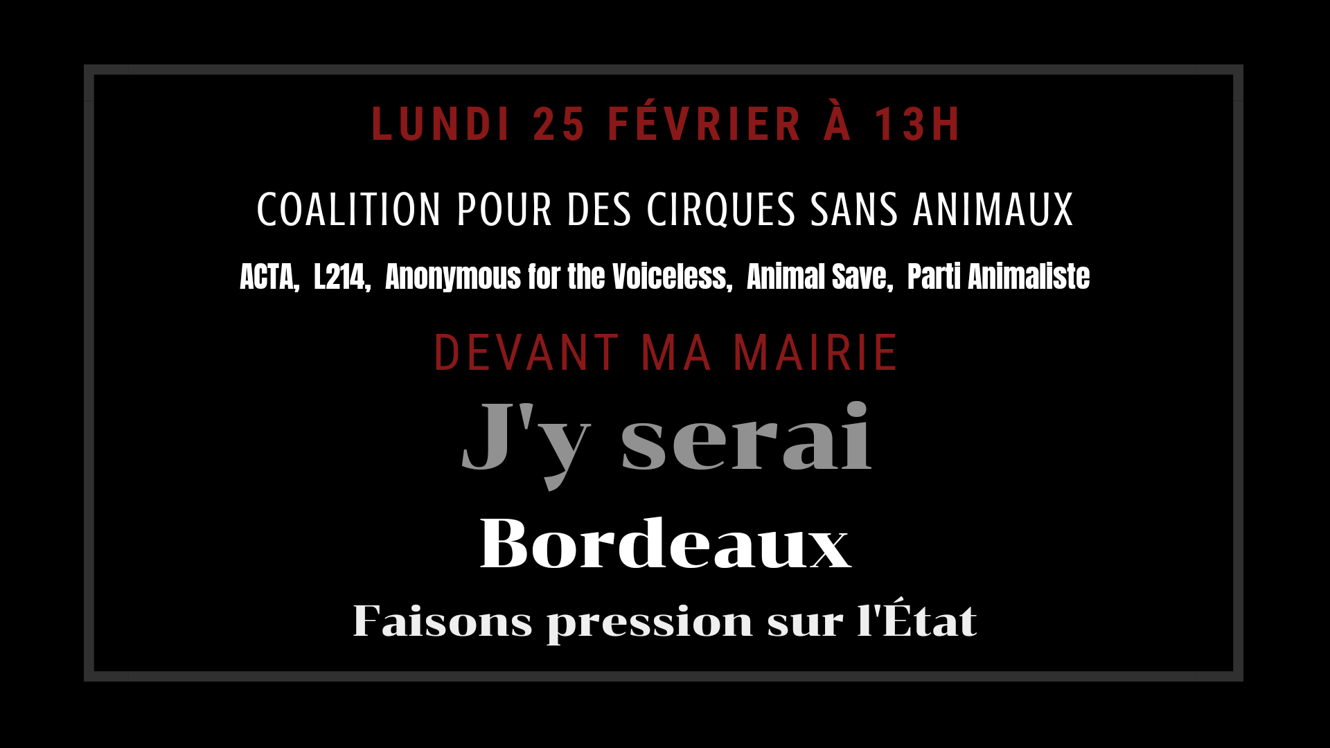 La lutte continue, nous nous retrouvons lundi 25 février à 13h devant la Mairie de Bordeaux pour demander à la Ville de se positionner contre l’exploitation des animaux par les cirques et de demander au gouvernement de légiférer sur la question.