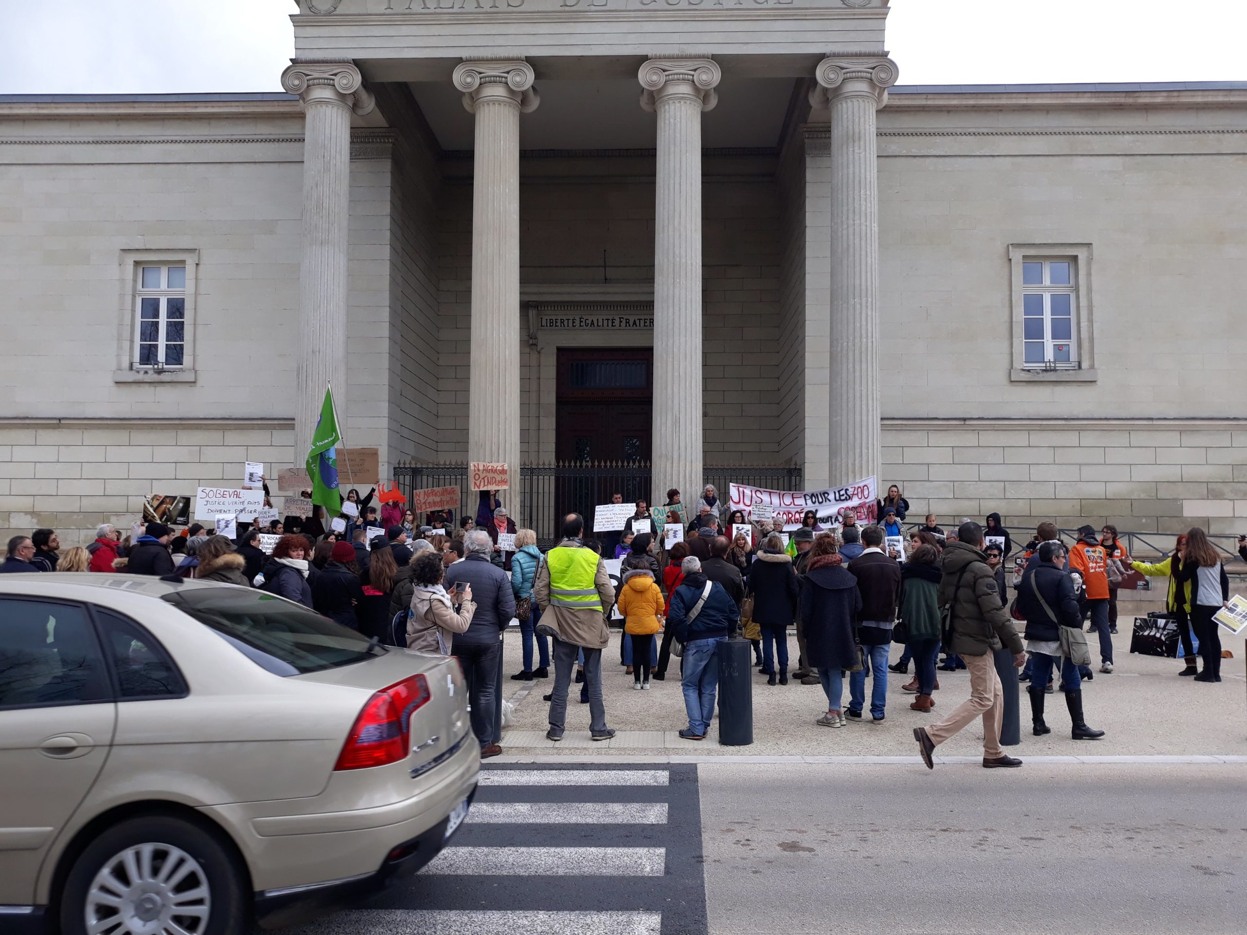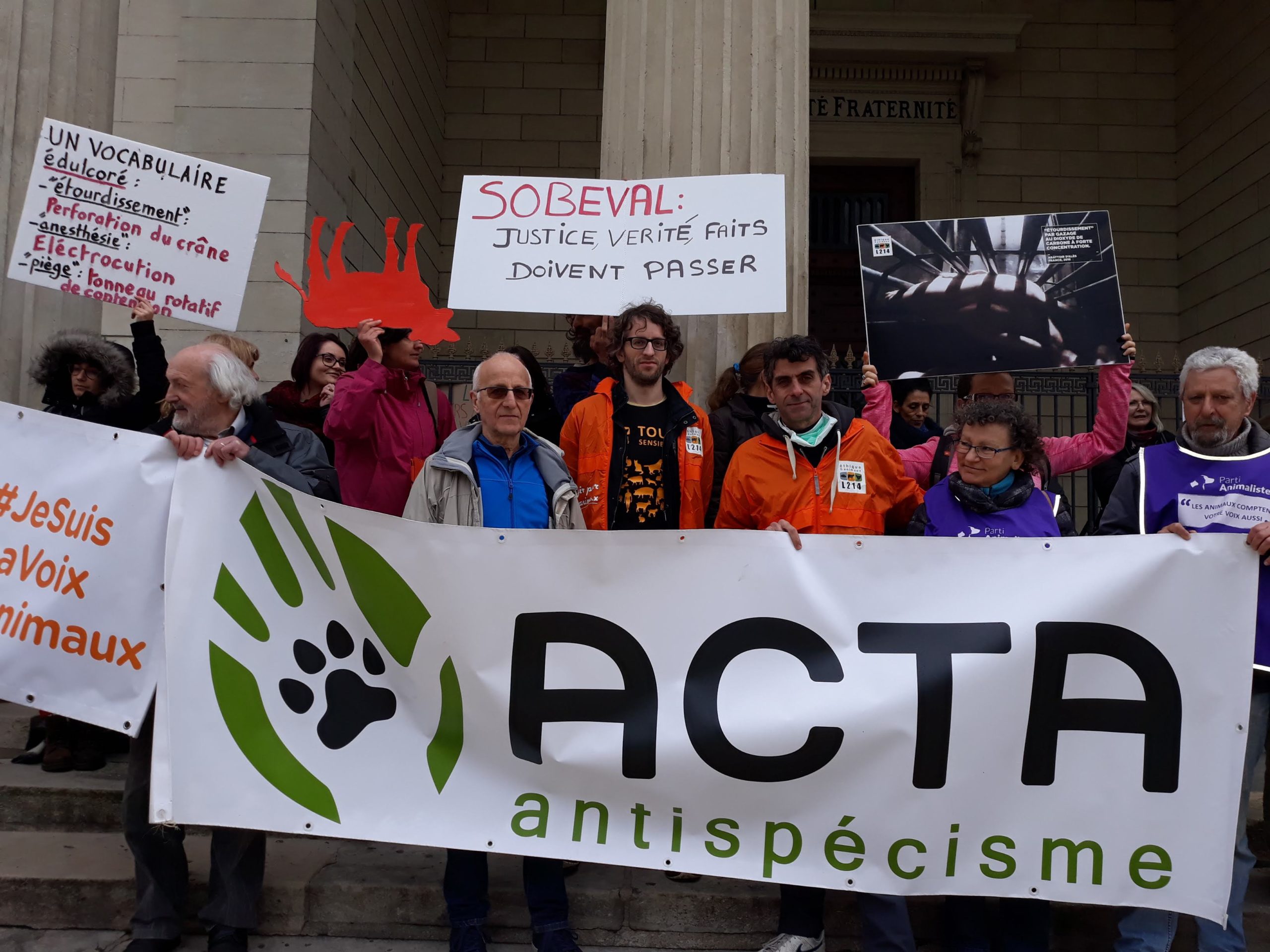 C’est donc tout naturellement qu’ACTA a répondu, aux côtés de l’antenne toulousaine de One Voice, des antennes Gironde et Corrèze du Parti Animaliste, de la CVN et de l’antenne de Limoges de L214, à l’appel à rassemblement citoyen de dernière minute devant le Palais de justice afin d’attirer l’attention du préfet de la Dordogne Frédéric Périssat, et du procureur de la république de périgueux Jean-François Mailhes sur les pratiques de l’abattoir la Sobeval.