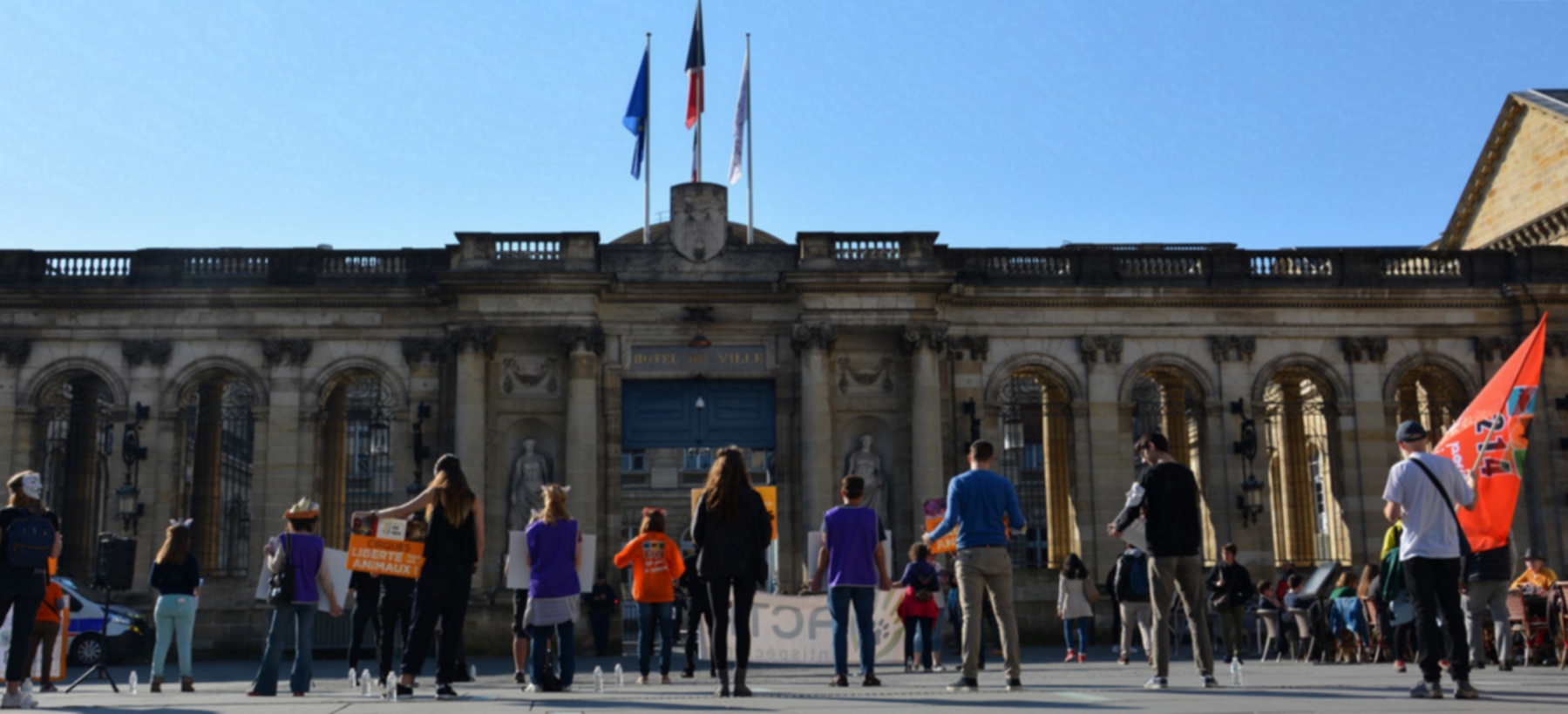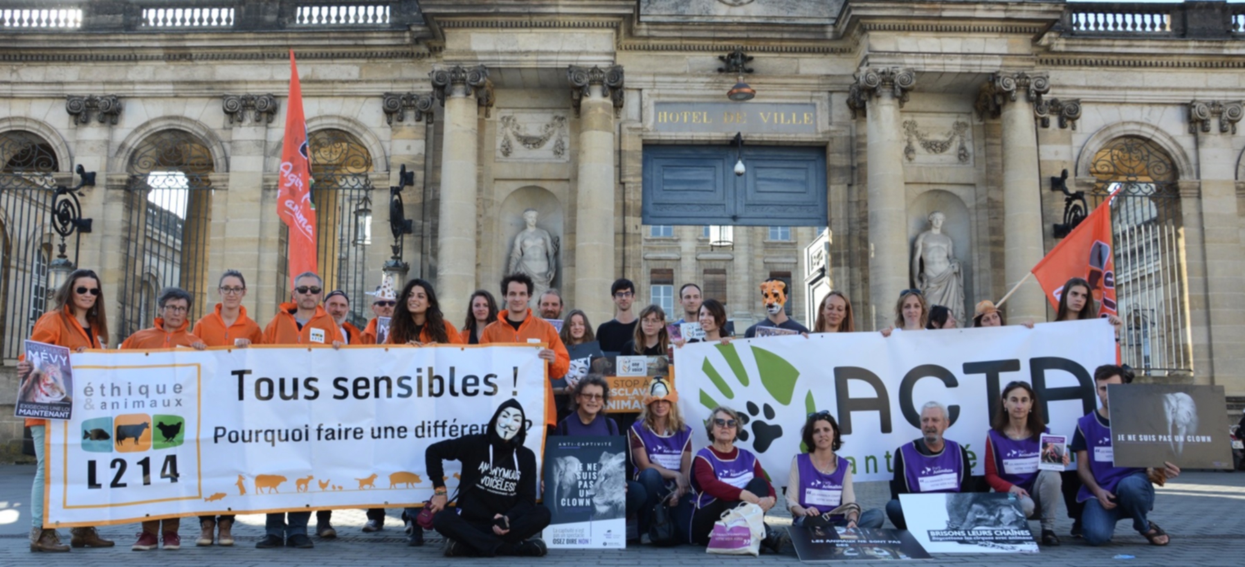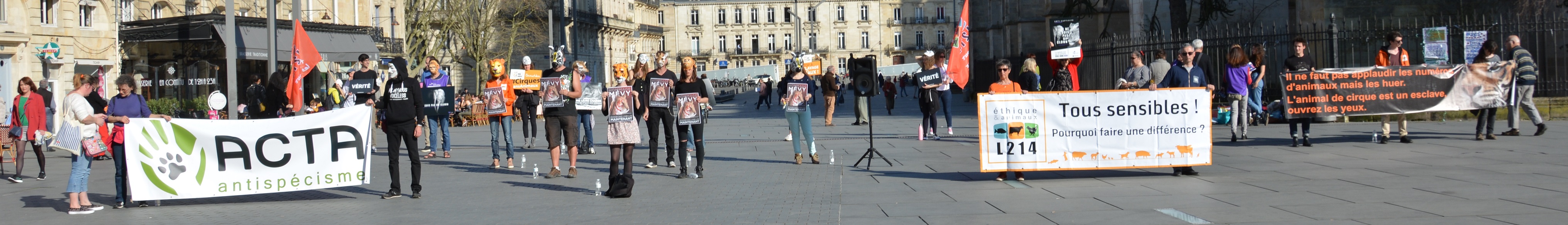 À Bordeaux, ACTA a formé une coalition avec les antennes bordelaises de L214, d’Anonymous for the Voiceless, d’Animal Save et du Parti Animaliste, pour organiser un happening le lundi 25 février, devant la Mairie de Bordeaux. S’il s’agissait d’un après-midi de semaine, les vacances universitaires et la motivation des militant·es nous ont tout de même amenées plus de trente personnes, de 13h à 17h. Nous avons formé un triangle équipé de masques d’animaux et de panneaux demandant une loi et affirmant notre volonté de cirques sans animaux. Anonymous for the Voiceless a d’abord formé un cube pour montrer au public des vidéos révélant l’état des animaux dans les cirques et leurs conditions de captivité, avant de venir gonfler les rangs du triangle. Des militantes se sont relayées pour lire à plusieurs reprises des discours adaptés à l’occasion.