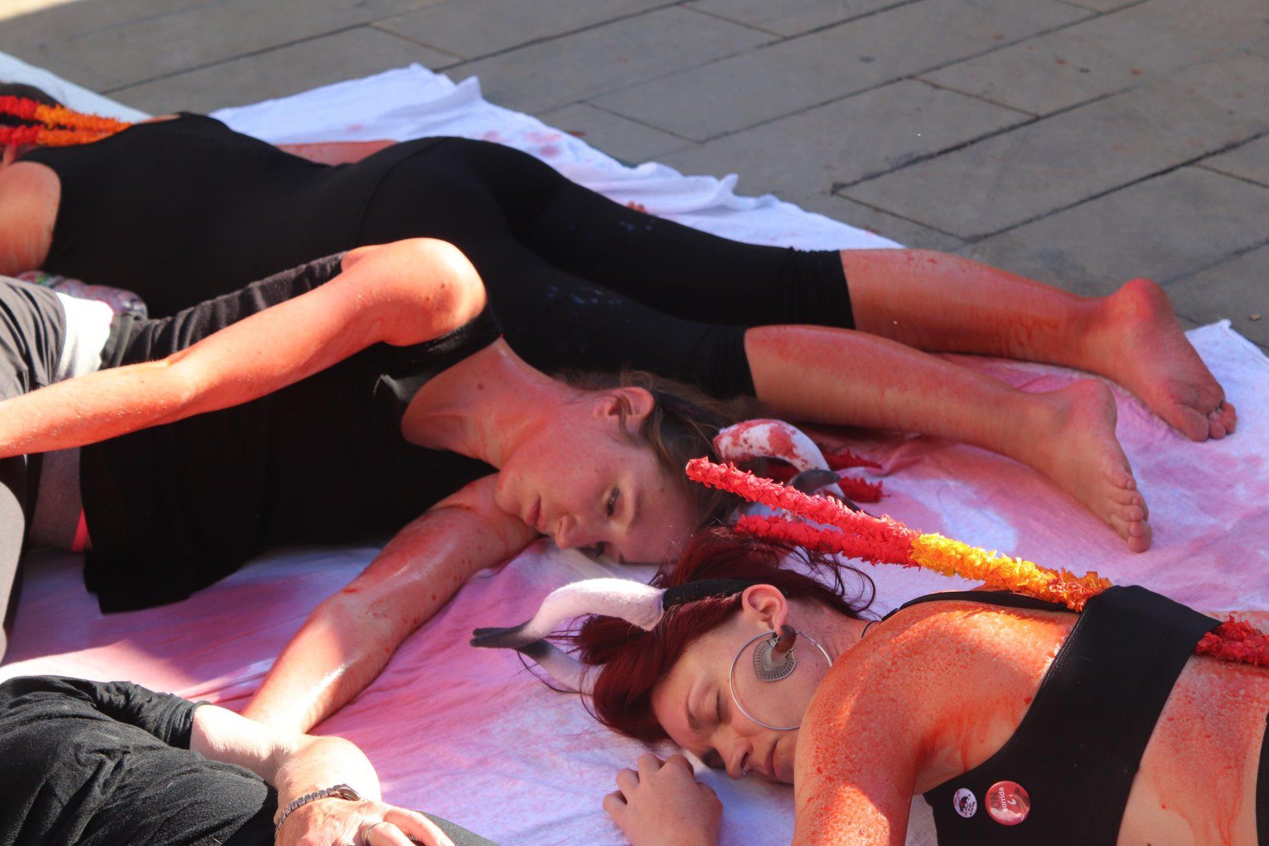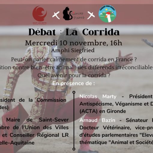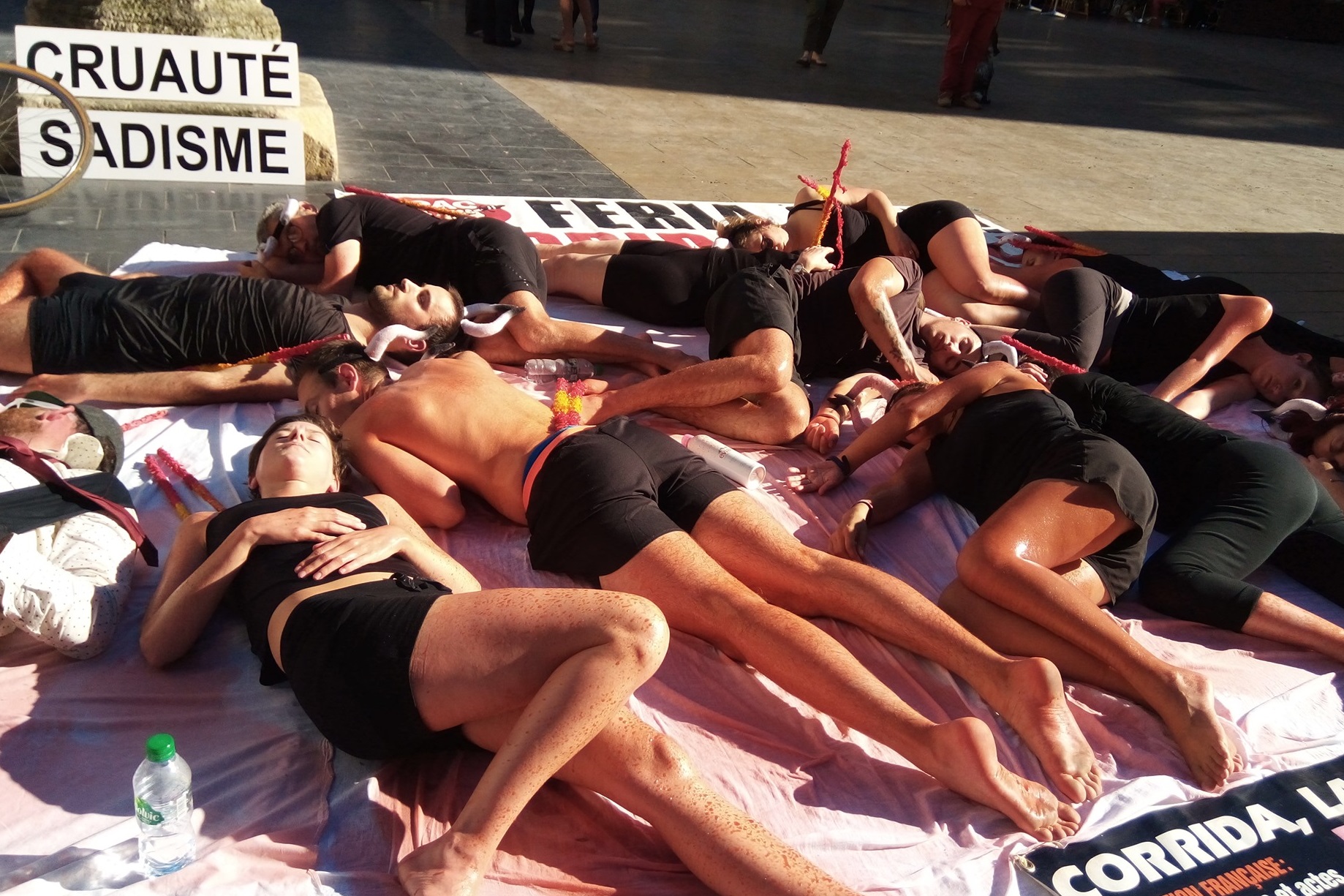 Alors que la saison de corrida bat son plein, à la veille de deux manifestations en Gironde (Captieux le 2 juin, la Brède le 22 juin), nous avons collaboré avec le Collectif Landes Anti-Corrida pour organiser un happening sur la place Saint Projet le vendredi 31 mai de 17h à 20h, afin d’appeler la fin de la corrida.
