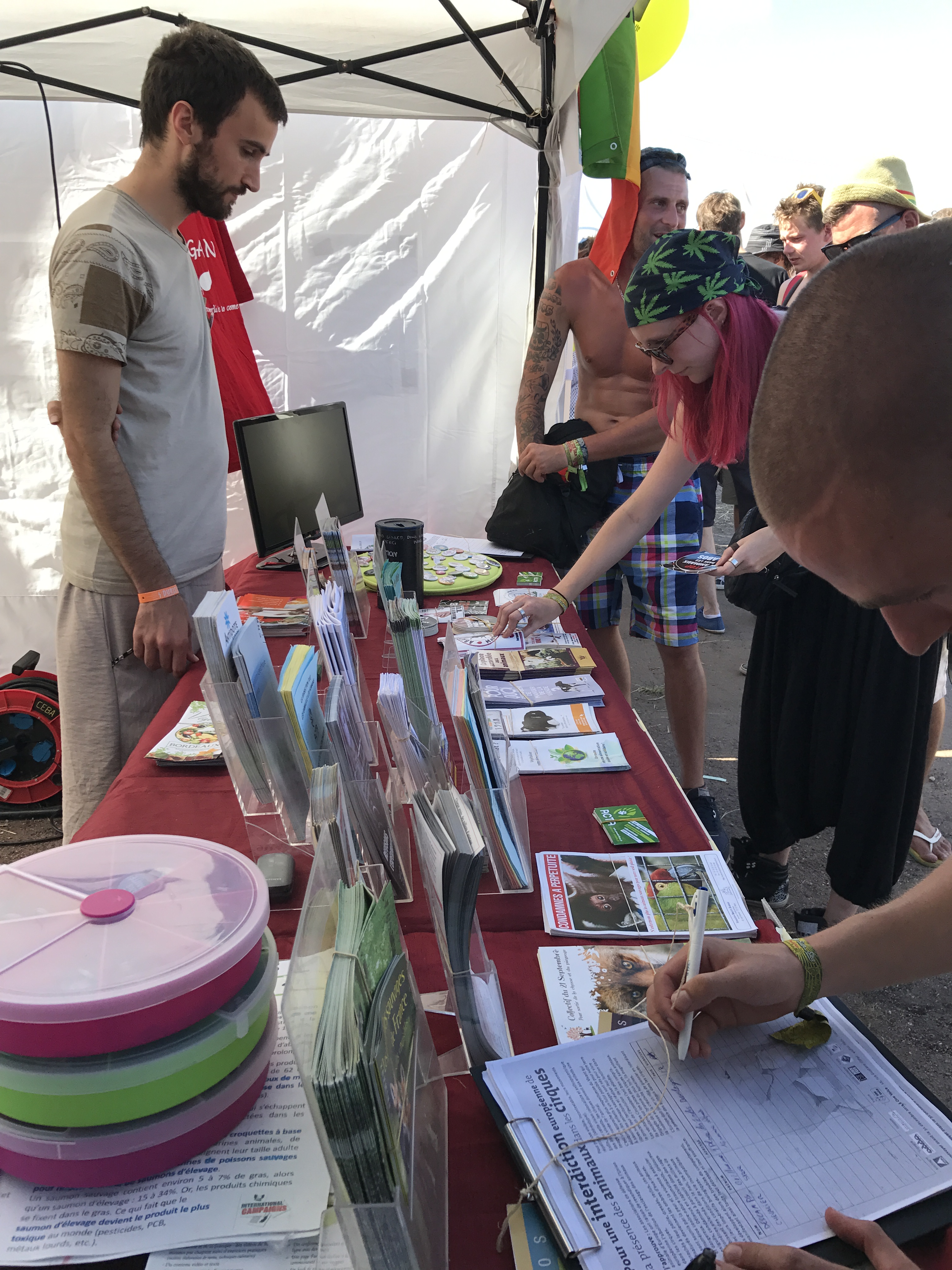 D’abord parce que le temps était beaucoup plus clément que l’an dernier où la chaleur était accablante. Ensuite l’emplacement du village associatif a eu un rôle important, voire primordial, car cette année nous étions à côté de l’entrée du festival ! Impossible donc de ne pas nous voir. Et nous en avons eu la preuve dès l’ouverture des portes où à peine les premiers festivaliers foulaient le sol du campus que déjà plusieurs personnes étaient à notre stand ainsi que ceux des autres associations présentes sur ces trois jours.