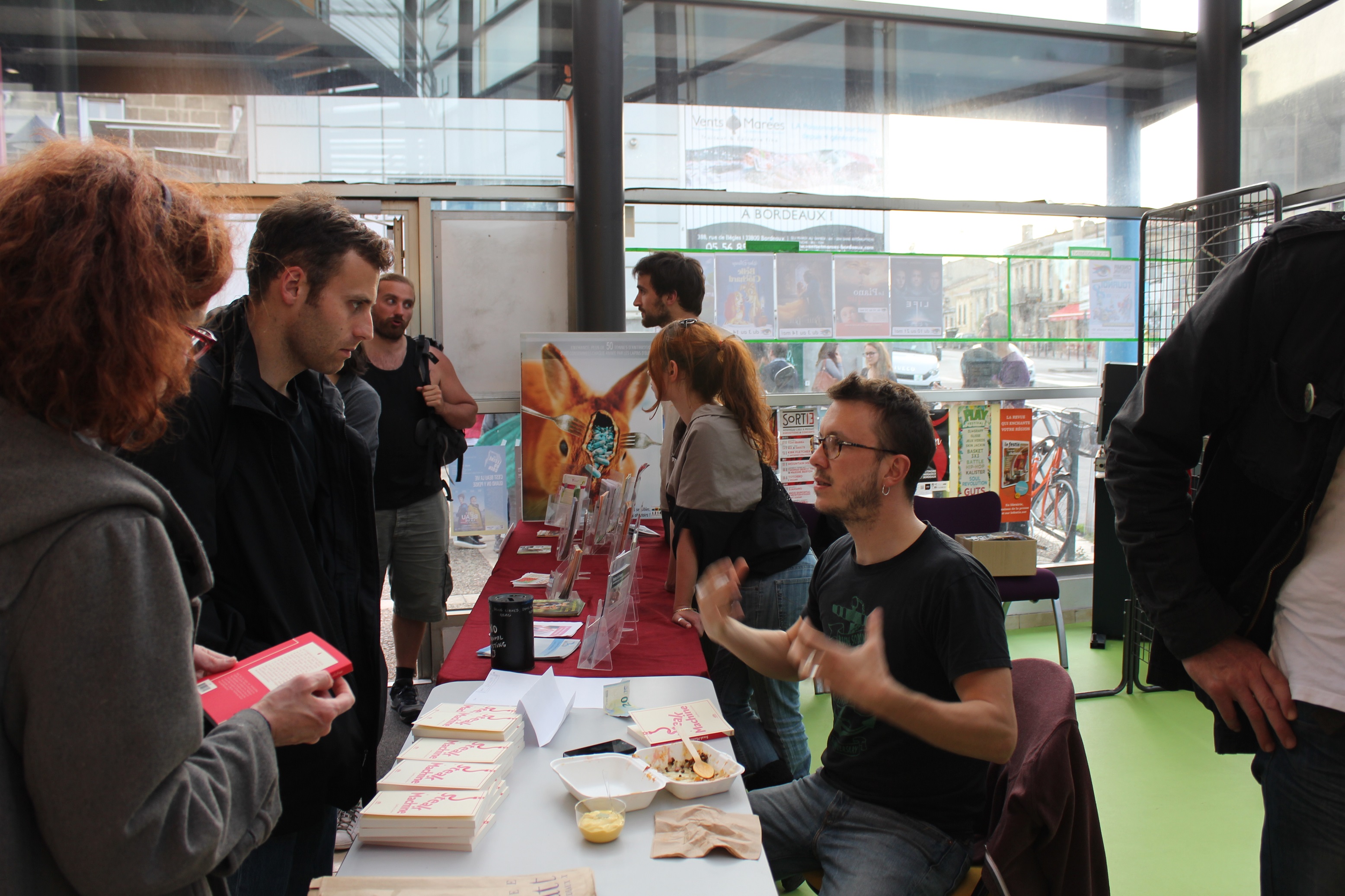 Il faisait beau, les organisateurs étaient fin prêts, les bénévoles fidèles présents pour vous accueillir et vous informer, de quoi faire quelques emplettes éthiques avec VeganEco, un peu d’information avec I-Boycott Bordeaux, des odeurs envoutantes provenant des saveurs exotiques et végétaliennes du Food-truck Wayo Wayo, les stands d’informations ACTA Gironde et L214 Bordeaux, la séance dédicace de notre invité d’honneur Geoffrey Le Guilcher * pour son livre « Steak machine », la projection du documentaire «Live and let live» possible grâce à la générosité du cinéma Le Festival de Bègles, le témoignage/débat de Geoffrey sur son expérience d’infiltration dans le plus grand abattoir de Bretagne et VOTRE présence à tous qui a fait de cette soirée une réussite.
