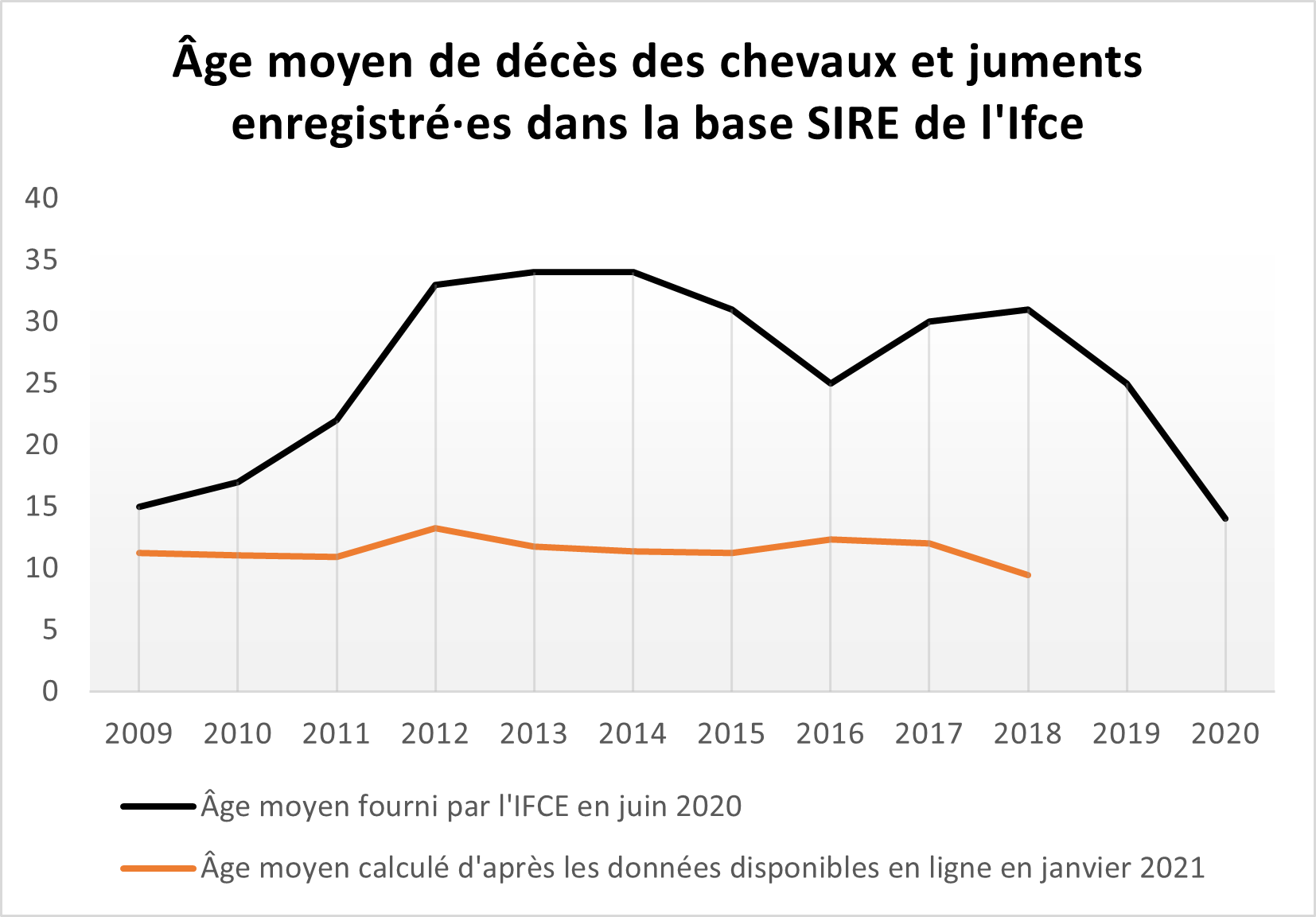 Après avoir saisi le tribunal administratif (le jugement n’a pas encore été rendu), l’IFCE m’a informé qu’une partie des données (datant de fin décembre 2018) étaient disponibles en ligne. En voulant reproduire les calculs avec ces données, j’ai constaté que non seulement la grosse majorité des entrées n’indiquaient pas la date de naissance et/ou la date de décès des individus concernés, mais aussi que certaines dates de naissance indiquaient l’année 1012, 1013, 1014, permettant de calculer que ces individus étaient décédés à 1000 ans. Une telle aberration pourrait expliquer pourquoi les moyennes de longévité fournies par l’IFCE ne collent pas avec les tranches d’âge (ces individus de 1000 ans étant contenus dans la tranche des plus de 40 ans, mais faisant artificiellement largement monter la moyenne). En recalculant à partir des données en ligne, on obtient une moyenne de longévité de 10 ans pour les chevaux et juments domestiqué·es dont l’âge de décès est connu (situation qui reste très minoritaire, il reste donc difficile de savoir de quelle manière ce manque de données biaise le résultat).