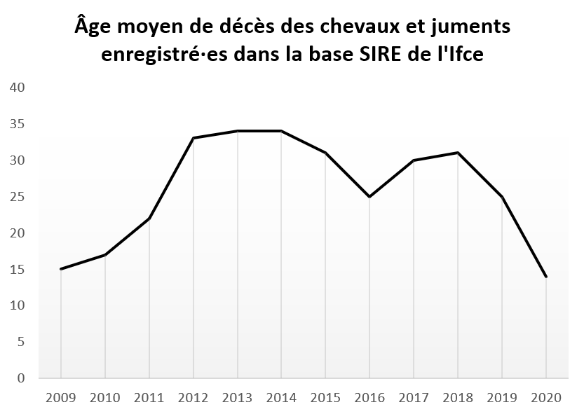 En ce qui concerne les équidés sauvages, bien qu’ils ne soient pas particulièrement concernés par la prédation (Roche/Ifce 2020), ils semblent ne vivre en moyenne que 7-8 ans en liberté, notamment suite à des blessures (Roche/Ifce 2019). Qu’en est-il des populations domestiquées ? C’est bien là le souci : nulle part on ne trouve de chiffres exhaustifs et vérifiables sur la mortalité et la longévité des chevaux et des juments domestiquées, que ce soit dans l’ensemble ou par secteur d’exploitation. Il faut dire que les morts ne sont pas toujours déclarées à l’Institut français du cheval et de l’équitation (Ifce), qui entretient le Système d’Informations Relatif aux Équidés (SIRE). Le SIRE contient pourtant des données sur la mortalité des chevaux et des juments qui y sont déclaré·es, mais comme j’ai pu le constater cette année, l’Ifce est réticent à communiquer ces données.