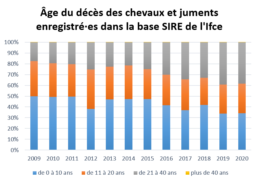 Le 30 avril, j’ai adressé à l’Ifce une demande concernant les données de mortalité et de longévité des chevaux et juments domestiqué·es en France. Après de longs échanges, j’ai pu obtenir début juin une partie des données de mortalité recensées par la base de données SIRE pour les dix dernières années, que voici :