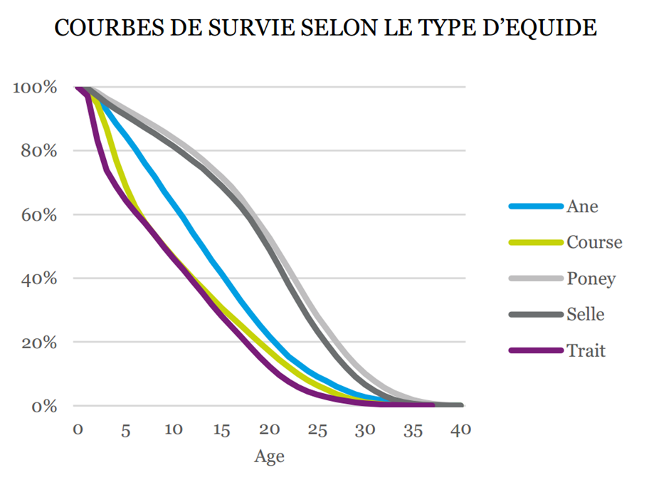 Ces données étant lacunaires et le système de collecte n’étant pas clair, il est difficile de les interpréter. De plus, avoir une moyenne de longévité de 30 ans sur une période où 65 à 80 % des animaux sont morts avant d’avoir 20 ans indique une répartition inégale des morts, la moyenne étant probablement tirée vers le haut par quelques individus morts très vieux. On voit d’ailleurs dans un document produit en juillet 2019 par l’Ifce que les courbes de survie donnent une répartition différente selon le type d’équidé, mais que quel que soit l’équidé, la survie au-delà de 30 ans est rare.