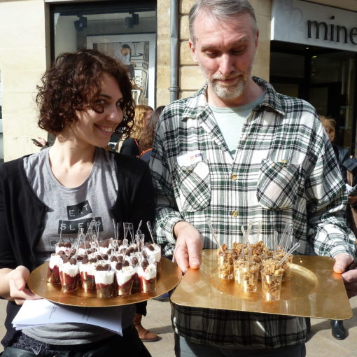 Ce sont donc Emilie et Laura pour L214, qui avaient en charge les thèmes élevages et abattoirs contre lesquels l’association se bat. Des dégustations individuelles de recettes sucrées, végétaliennes, envoutantes et plus savoureuses les unes que les autres, étaient proposées aux passants afin de les sensibiliser à une cuisine sans cruauté. Pourquoi ne pas y succomber si en plus de faire plaisir à nos papilles, on ne contribue pas à l’exploitation et à la souffrance animale ?