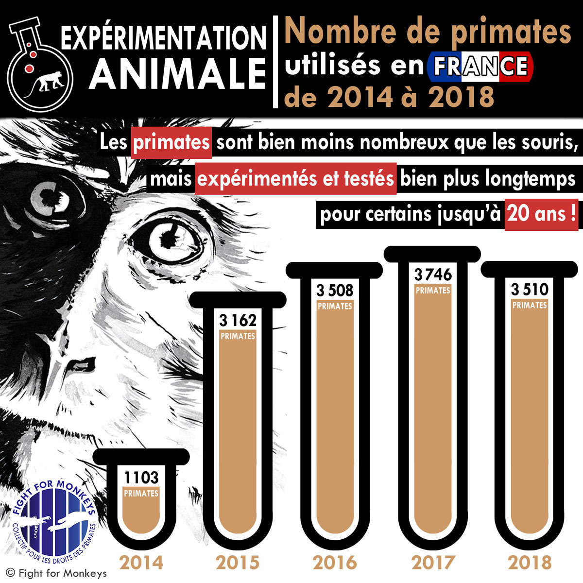 L’Union Européenne prévoit également la publication des statistiques sur l’utilisation des animaux à des fins scientifiques – le Ministère de l’Enseignement Supérieur, de la Recherche et de l’Innovation publie donc chaque année une nouvelle enquête statistique sur l’utilisation des vertébrés et des céphalopodes. Ces enquêtes n’incluent donc pas les invertébrés, ni les animaux d’élevage de souches transgéniques, ni encore les animaux tués pour récupérer leurs tissus ou leurs organes [*]. Elles sont cependant utiles, notamment pour constater qu’entre 2015 et 2018, le nombre d’animaux déclarés n’a pas diminué, stagnant à presque 2 millions par an, tandis que le nombre de primates a légèrement augmenté (passant de 3162 à 3746, puis à 3510) et que la proportion d’expériences « sévères » (c’est-à-dire générant des douleurs et/ou une anxiété profondes et durables) a quasiment doublé, passant de 10% à 19%. Il semble être prévu que la Commission Européenne, à partir de 2023, mette en place une base de données indexée en ligne. Ces données sont importantes et intéressantes, bien que le détail des calculs et les règles qui régissent les déclarations ne soient pas nécessairement compréhensibles pour le public. Par exemple, les données émanant de l’Institut de Recherches Biomédicales de l’Armée pourraient ne pas être incluses dans ce rapport (le 9 avril 2020, Arnaud Bazin, sénateur LR, a émis une question demandant la raison de cette omission et la date à laquelle il serait possible de consulter les données statistiques concernant les animaux utilisés par l’armée à des fins scientifiques).