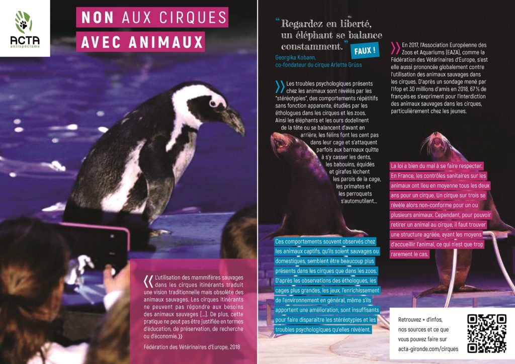 ACTA, dans la lignée abolitionniste, ne demande pas un meilleur traitement des animaux, de plus grandes cages contenant de quoi s’amuser un peu, mais une libération des animaux, une interdiction de leur captivité, pour toutes les raisons évoquées ici. Nous ne sommes pas « anti-cirques », comme Fredo Douchet l’a suggéré dans une discussion que l’on ne voit pas sur les vidéos et comme on entend parfois. Nous voulons des cirques sans exploitation des animaux, des cirques dans lesquels des acrobates, des jongleurs, des clowns et autres artistes consentants, nous fassent rêver.